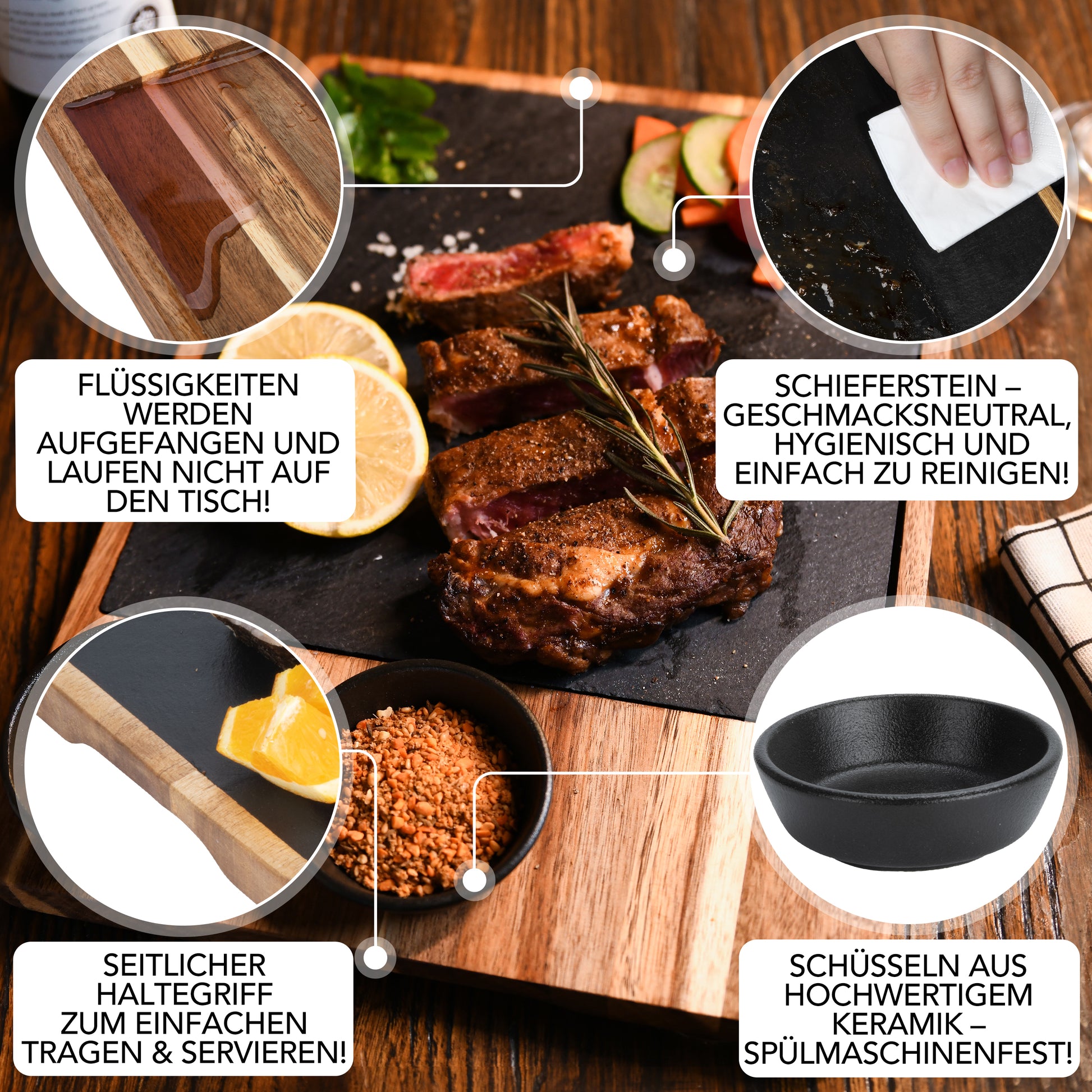 Servierbrett XXL ‘Domingo' 2er Set aus FSC® Akazien-Holz mit Schieferplatte & Saucen Schüsseln