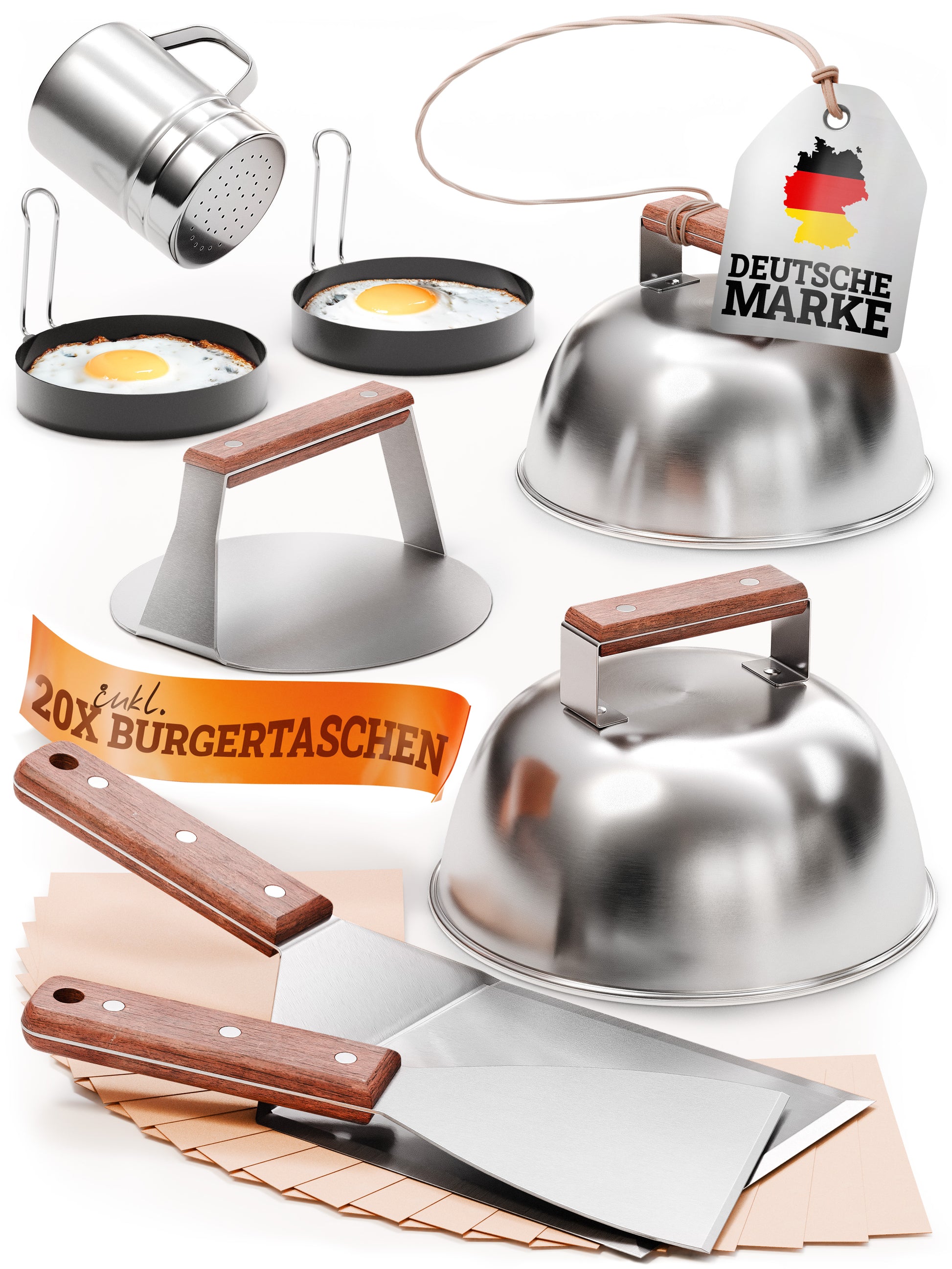Erlebe die perfekten Smash Burger mit dem LIKAYA Smash Burger Master-Set! Dank dem Edelstahl-Smasher entsteht ein saftiges Fleisch mit perfekt flachem Patty und köstlichem Zischen. Die Burgerglocken lassen den Käse schmelzen, während der Holzgriff für sicheres Handling sorgt. Kreiere kreative Burgerkreationen ohne Grenzen!